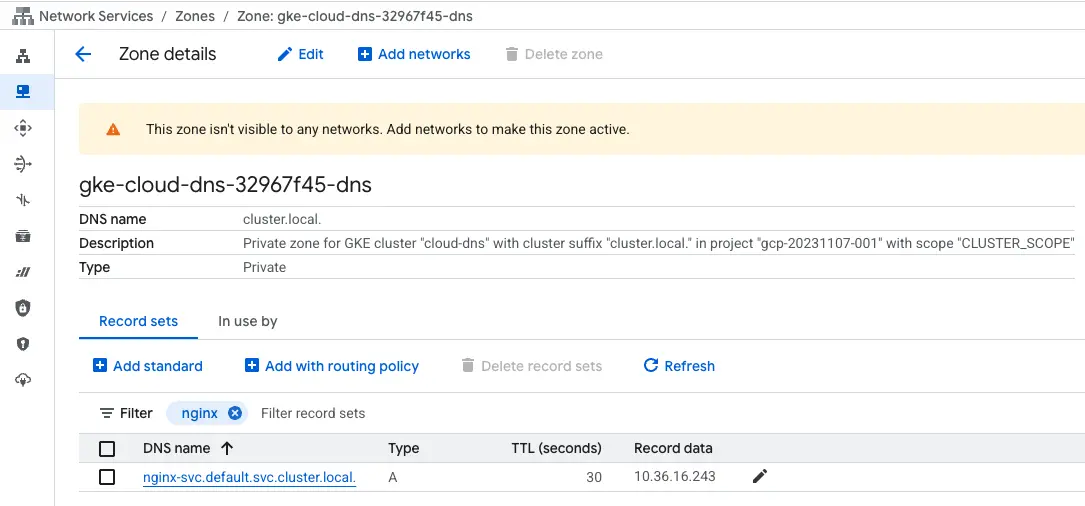 在建立完 Cluster 後,可以先觀察在 Cloud DNS 是否新增的 Private Zone